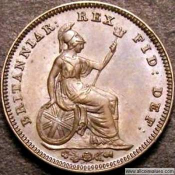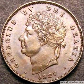 Values, images, and specifications for the 1827 1/3 farthing from the UK.