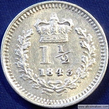 Values, images, and specifications for the 1843 3 halfpence from the UK.