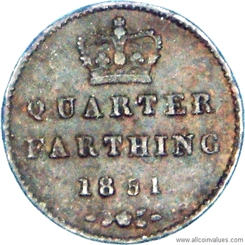 Values, images, and specifications for the 1851 1/4 farthing from the UK.
